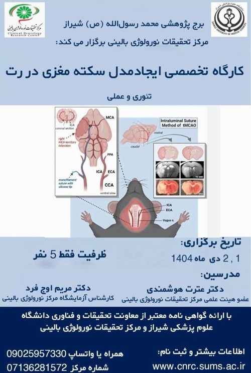 برج پژوهشی محمد رسول الله (ص) مرکز تحقیقات نورولوژی بالینی برگزار می کند: کارگاه تخصصی ایجاد مدل سکته مغزی در رت تئوری و عملی