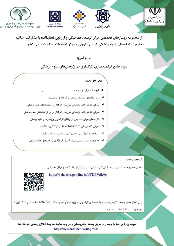 به اطلاع می رساند" برنامه جامع توانمندسازی اثرگذاری در پژوهش های علوم پزشکی" ویژه مدیران تحقیقات و فناوری، اعضای محترم هیات علمی، محققین و کارشناسان دانشگاه ها/دانشکده ها و مراکز تحقیقات علوم پزشکی از تاریخ 17 لغایت 25 آبان 1404 از ساعت 10 الی 12 توسط معاونت تحقیقات و فناوری وزارت متبوع برگزار می گردد.