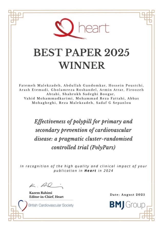 این مقاله ارزشمند که در سال 2024 در نشریه معتبر Heart وابسته به انتشارات BMJ Group منشر شده است ، به بررسی اثربخشی قرص ترکیبی " polypill" در پیشگیری اولیه و ثانویه از بیماری های قلبی-عروقی پرداخته و بعنوان بهترین مقاله سال در سال 2025 انتخاب شده است .